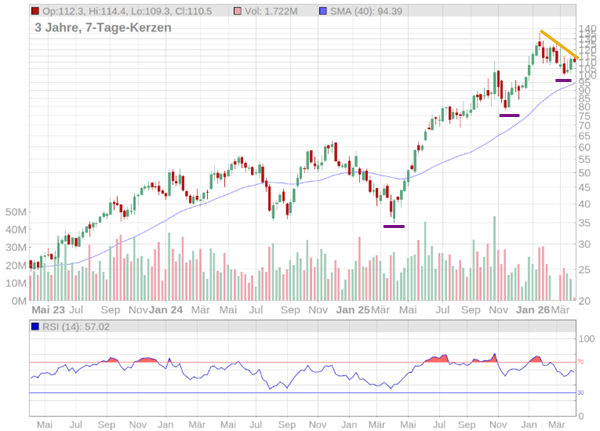 In den letzten Wochen ist das Volumen bei fallenden Kursen eher niedrig. Das deutet darauf hin, dass kein großer Verkaufsdruck herrscht, sondern Anleger einfach nur Gewinne mitnehmen. Nach der Phase der Überhitzung ist der RSI wieder in den neutralen Bereich zurückgekommen. Die Aktie hat wieder „Platz zum Atmen“ für den nächsten Anstieg. Ein Ausbruch über die orange Trendlinie bei rund 115 USD würde ein technisches Kaufsignal generieren.