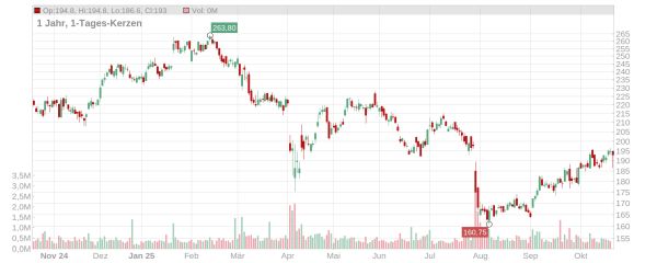 Die Analysten sehen meist ebenfalls Spielraum bei dem Titel. Nach den vorläufigen Q3-Zahlen hat beispielsweise die Deutsche Bank das Kursziel für die Adidas-Aktie bei 280 Euro bestätigt. Andere sehen das Papier unter anderem zwischen 220 Euro (Jefferies) und 274 Euro (UBS). Kommende Woche wird das DAX-Unternehmen die endgültigen Zahlen für das dritte Quartal präsentieren.