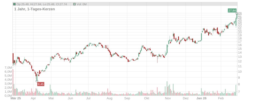 Der Kurs der Aixtron Aktie klettert zum Beginn des letzten Handelstages der Woche nochmal deutlich um mehr als sieben Prozent und notiert aktuell bei etwa 27,50 Euro – so hoch wie seit zwei Jahren nicht mehr (Stand: 27. Februar 2026, ca. 11 Uhr). Seit Jahresbeginn hat das Papier bereits fast 60 Prozent zugelegt.