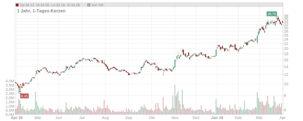 Der Kurs der Aixtron Aktie notiert im heutigen Vormittagshandel etwas fester bei gut 33 Euro (Stand: 1. April 2026, ca. 12 Uhr). Damit hat sich das Papier von dem Mini-Einbruch der letzten Tage etwas erholt. Vergangene Woche notierte der MDAX-Titel noch über der Marke von 36 Euro – seit Jahresbeginn steht ein riesiges Plus von mehr als 90 Prozent auf der Kurstafel.