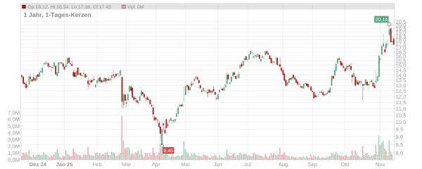 Der Kurs der Aixtron-Aktie ist in den letzten Handelstagen um gut zehn Prozent eingebrochen und notiert aktuell bei etwa 17.50 Euro (Stand: 17. November 2025, ca. 10.45 Uhr). Vorausgegangen war bei dem Papier jedoch eine eindrucksvolle Rally mit plus 50 Prozent in rund zwei Wochen und der Sprung auf ein Jahreshoch bei 20 Euro.