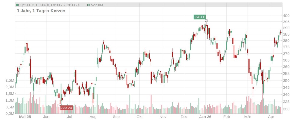 Der Kurs der Allianz Aktie tendiert heute seitwärts und notiert aktuell bei gut 386 Euro (Stand: 17. April 2026, ca. 11 Uhr). Zuletzt hat das Papier innerhalb von drei Wochen rund zehn Prozent zugelegt – das Rekordhoch aus Anfang Januar (knapp unter der Marke von 400 Euro) ist damit nicht mehr weit entfernt.