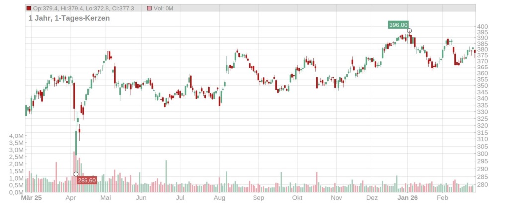Der Kurs der Allianz Aktie ist zum Start in den Handelstag nach der Präsentation der Rekordzahlen für 2025 leicht gesunken und notiert aktuell bei gut 377 Euro (Stand: 26. Februar 2026, ca. 10 Uhr). Seit Jahresbeginn steht bei dem Papier ebenfalls ein kleines Minus auf der Kurstafel.
