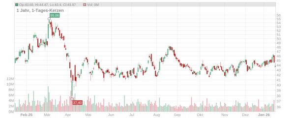 Der Kurs der BASF Aktie ist in den letzten Handelstagen gesunken und notiert aktuell bei knapp 44 Euro (Stand: 19. Januar 2026, ca. 12 Uhr). Auch die drohende Eskalation im Handelskonflikt zwischen den USA und Europa hat zum Wochenstart für gedämpfte Stimmung gesorgt. Seit Jahresbeginn steht ein leichtes Minus auf der Kurstafel.