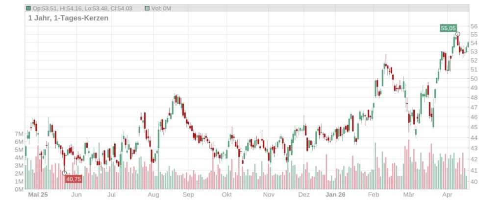 Der Kurs der BASF Aktie ist zuletzt recht deutlich gestiegen und notiert im heutigen Vormittagshandel bei rund 54 Euro – und damit nur leicht unter dem Mehrjahreshoch von 55 Euro (Stand: 22. April 2026, ca. 9.30 Uhr). Seit Jahresbeginn steht nun bereits ein Plus von gut 20 Prozent auf der Kurstafel.