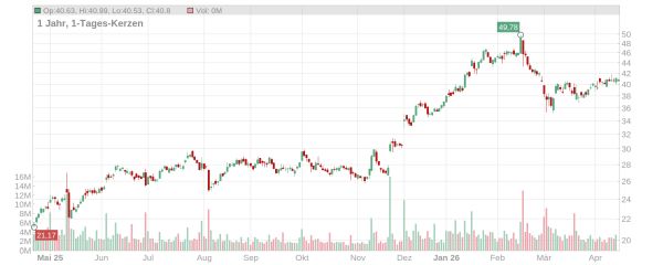 Der Kurs der Bayer Aktie notiert zum Start in die neue Handelswoche auf einem ähnlichen Niveau wie zuletzt bei rund 41 Euro (Stand: 20. April 2026, ca. 9 Uhr). Seit Jahresbeginn steht ein Plus von etwa zehn Prozent auf der Kurstafel – auf Jahressicht sind es sogar fast 90 Prozent.