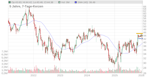 Mit einem erwarteten Kurs-Gewinn-Verhältnis von 20,7 ist der Titel historisch fair bewertet und bietet Anlegern zudem eine solide Dividendenrendite von 1,6 Prozent. Charttechnisch befindet sich die Aktie gerade in einer Range zwischen 42 und 45 Euro. Die weitere Richtung wird uns ein Ausbruch zur Oberseite (über die orange Line), oder ein Durchbruch nach unten (blau gestrichelte Linie) zeigen.