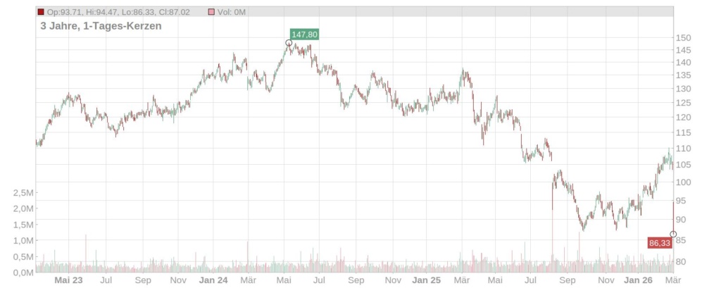 Der Kurs der Beiersdorf Aktie ist nach der Präsentation der Geschäftszahlen im Vormittagshandel deutlich eingebrochen und notiert aktuell 17 Prozent tiefer bei 87 Euro (Stand: 03. März 2026, ca. 10.30 Uhr). Das ist der niedrigste Kurs seit mehr als drei Jahren. Im Februar hatte sich das Papier erstmals seit mehreren Monaten über die Marke von 100 Euro gekämpft, seit Jahresbeginn steht nun wieder ein leichtes Minus auf der Kurstafel.
