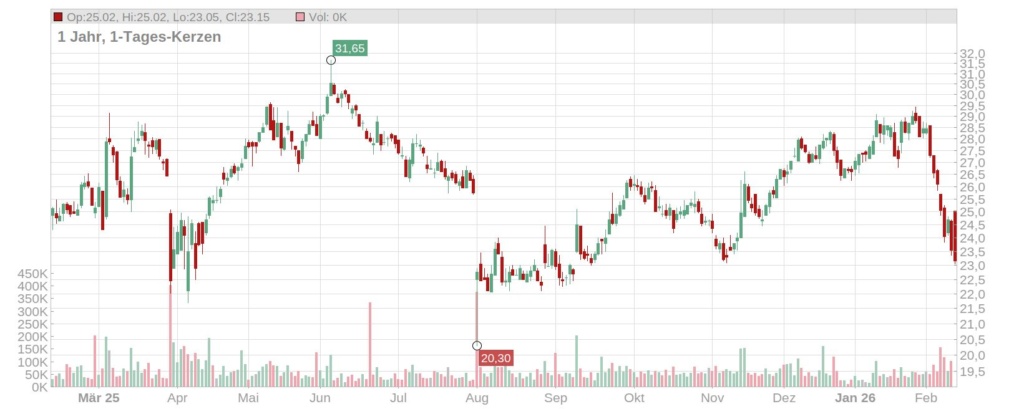 Der Kurs der Cancom Aktie ist im heutigen Vormittagshandel nach der Präsentation der Quartalszahlen leicht gesunken und notiert aktuell bei gut 23 Euro (Stand: 12. Februar 2026, ca. 10.30 Uhr). In den letzten zwei Wochen hat das Papier des IT-Dienstleisters damit fast 20 Prozent verloren.