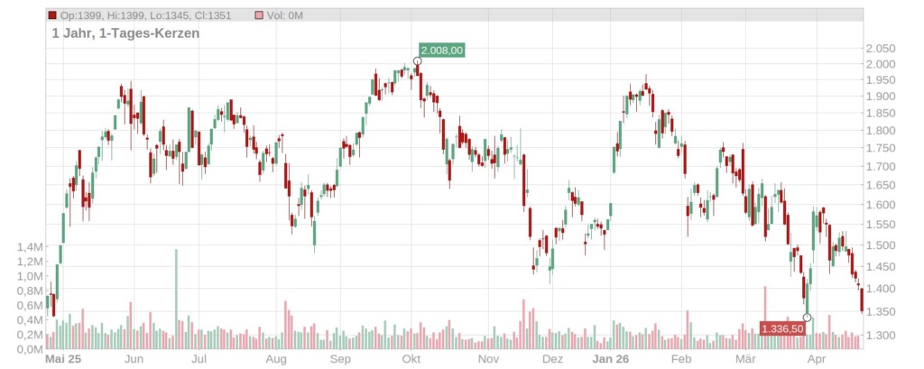 Wer bei diesen exzellenten fundamentalen Nachrichten mit einem Kurssprung gerechnet hat, wurde am 24. April 2026 überrascht. Trotz der vollen Auftragsbücher geriet das Wertpapier unter Druck. Bereits am Vortag hatte der Kurs leicht nachgegeben, bevor er am 24. April im Tagesverlauf deutlich um -2,37 % bis auf über -3,20 % abrutschte. Zuletzt notierte die Rheinmetall Aktie im XETRA-Handel bei einem Stand von rund 1.350 €.