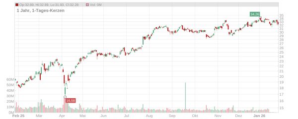 Der Kurs der Deutsche Bank Aktie konnte nach der Präsentation der Geschäftszahlen im heutigen Vormittagshandel zwar nicht zulegen, notiert aber mit gut 32 Euro aktuell nur knapp unter dem Mehrjahreshoch von etwa 34 Euro (Stand: 29. Januar 2026, ca. 11 Uhr). Seit Jahresbeginn steht ein kleines Minus von gut zwei Prozent auf der Kurstafel.