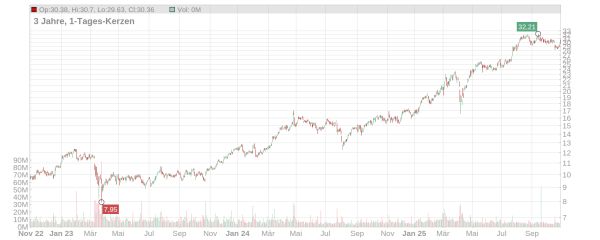 Der Kurs der Deutsche Bank-Aktie kletterte im Vormittagshandel nach der Präsentation der Quartalszahlen um etwa 2,5 Prozent und notiert wieder knapp über der Marke von 30 Euro (Stand: 29. Oktober 2025, ca. 12 Uhr). Mitte September hatte der DAX-Konzern mit 32 Euro den höchsten Kurs seit mehr als zehn Jahren erreicht.