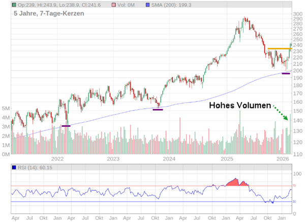 Der langfristige Trend zeigt, dass die Aktie nach einem massiven Höhenflug 2024/25 in eine Korrekturphase überging. Doch jetzt scheint der Wind zu drehen. Bei um die 200 Euro hat die Aktie offenbar einen stabilen Boden im Bereich der 200-Wochenlinie gefunden. Wie im Chart markiert, begleiten hohe Handelsumsätze den jüngsten Anstieg über die Hürde bei 234 Euro (orange Linie).