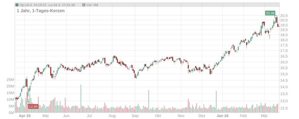 Der Kurs der E.ON Aktie ist in den vergangenen Handelstagen erstmals seit rund 15 Jahren über die Marke von 20 Euro geklettert und notiert aktuell bei etwa 19,50 Euro (Stand: 20. März 2026, ca. 10 Uhr). Die Rally ist beeindruckend: Seit Anfang Januar hat das Papier etwa 20 Prozent zugelegt und auf Jahressicht sind es 47 Prozent.