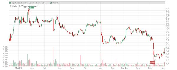 Der Kurs der Evotec Aktie ist im heutigen Vormittagshandel nach der Präsentation der Geschäftszahlen deutlich um rund acht Prozent geklettert und notiert aktuell bei etwa 4,80 Euro (Stand: 8. April 2026, ca. 10.30 Uhr). Allerdings steht seit Jahresbeginn ein Minus von zwölf Prozent auf der Kurstafel und im März notierte das Papier so tief wie seit fast zehn Jahren nicht mehr.