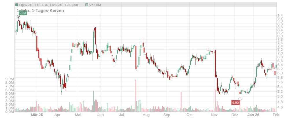 Der heutige Kurssprung von rund 9,5 Prozent auf 6,53 Euro (Stand: 15:15 Uhr) beendet eine kurze Korrekturphase. Nach zwei schwächeren Handelstagen knüpfen die Papiere damit wieder an ihre jüngste Erholung an. Seit Jahresbeginn summiert sich das Plus mittlerweile auf fast 20 Prozent. Charttechnisch rückt nun die psychologisch wichtige Marke von 7 Euro sowie langfristig die 200-Tage-Linie in den Fokus, deren nachhaltiges Überwinden ein weiteres Kaufsignal generieren würde.