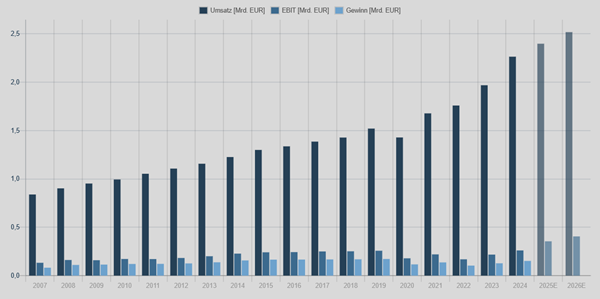 Hervorzuheben ist, dass das Geschäft in allen Regionen wuchs; beeindruckend das Umsatzplus von 46 Prozent in den USA, wo Fielmann in den vergangenen Jahren diverse Mitbewerber geschluckt hat. In der nachfolgenden Grafik sind die 2025er-Zahlen ausgegraut, weil sie noch vorläufig sind. Offiziell werden sie erst am 30. April verkündet, was für das Trading in den meisten Fällen nicht relevant ist. Für die Aktionäre springt in Form einer Dividendenerhöhung von 1,15 EUR auf 1,40 EUR etwas heraus.