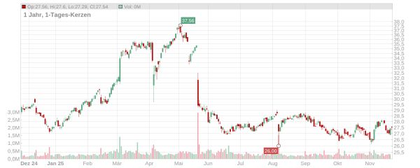 Der Kurs der Freenet-Aktie tendiert in den letzten Monaten unterm Strich eher seitwärts und notiert aktuell bei etwa 27,50 Euro (Stand: 24. November 2025, ca. 13 Uhr). Damit liegt das Papier auf demselben Niveau wie zu Jahresbeginn – das Hoch aus dem zweiten Quartal bei 37 Euro ist jedoch ein gutes Stück entfernt.