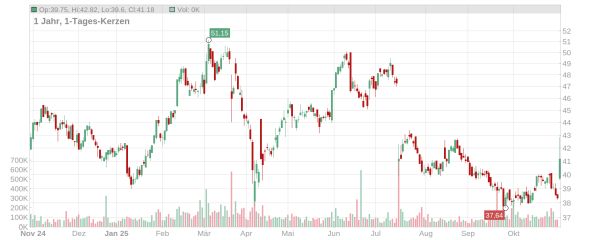 Der Kurs der Fuchs-Aktie ist zum heutigen Handelsstart nach der Präsentation der Quartalszahlen deutlich um fast zehn Prozent geklettert und notiert aktuell bei rund 42 Euro (Stand: 31. Oktober 2025, ca. 10 Uhr). Seit Jahresbeginn hat sich der Kurs des Papiers unterm Strich kaum bewegt.
