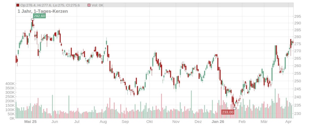 Der Kurs der Hannover Rück Aktie konnte in einem volatilen Gesamtmarkt in den letzten Wochen unterm Strich zulegen und notiert aktuell bei rund 276 Euro (Stand: 10. April 2026, ca. 12 Uhr). Das ist der höchste Stand seit Sommer letzten Jahres und im Vergleich zum Tief aus Januar hat das Papier etwa 18 Prozent zugelegt.