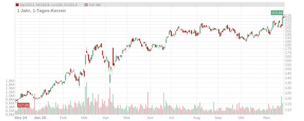 Der Kurs der Heidelberg Materials-Aktie ist im heutigen Vormittagshandel auf ein neues Allzeithoch geklettert und notiert aktuell bei gut 222 Euro (Stand: 26. November 2025, ca. 11.30 Uhr). Damit hat das Papier in den letzten beiden Handelstagen in der Spitze mehr als acht Prozent zugelegt – und seit Jahresbeginn steht ein Plus von satten 86 Prozent auf der Kurstafel.