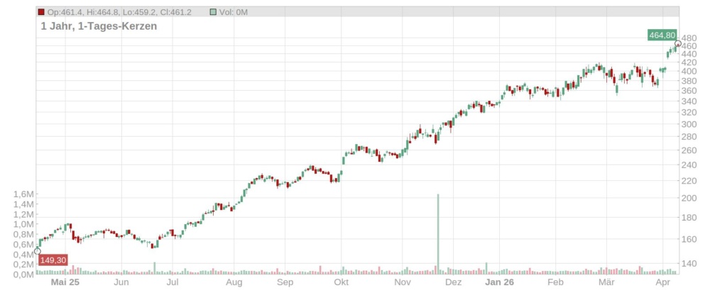 Zum Handelsstart ist der Kurs der Hochtief Aktie heute auf ein neues Allzeithoch von fast 465 Euro geklettert und notiert aktuell leicht darunter bei rund 461 Euro (Stand: 14. April 2026, ca. 10.30 Uhr). Damit setzt das Papier die Rekordjagd der letzten Monate und Jahre fort – seit Anfang Januar steht ein Plus von 36 Prozent auf der Kurstafel.