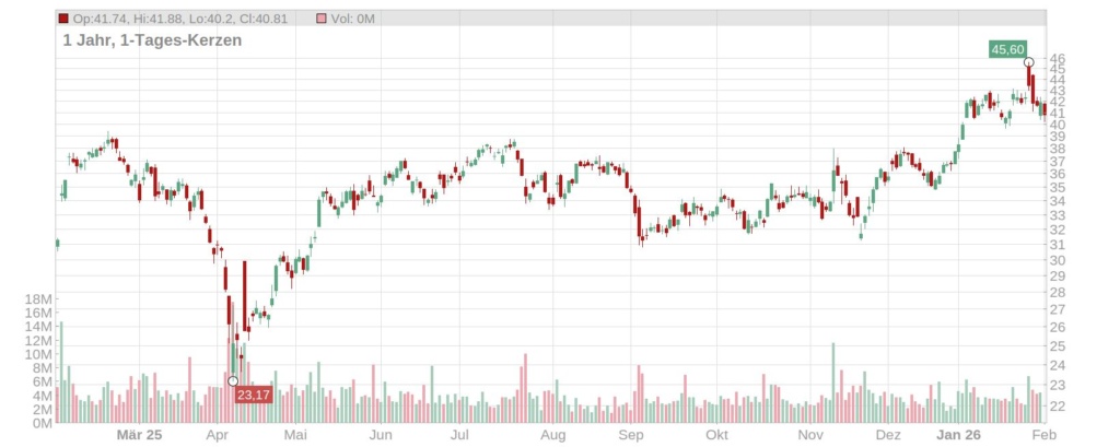 Risiken: Enttäuscht der Ausblick oder revidiert das Management die Jahresziele aufgrund der Währungsschwankungen (Planungskurs: 1,15 US-Dollar/Euro) nach unten, droht ein Test der Unterstützungslinien im Bereich von 38 Euro.