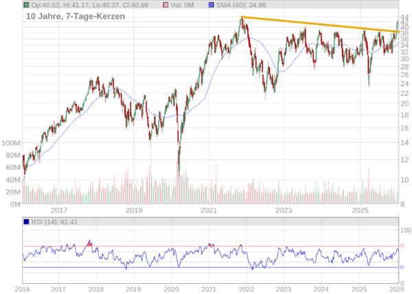 Aktuell notiert das Papier bei knapp 41 Euro. Technisch gesehen hat der RSI-Wert nach unten gedreht, was auf eine Verschnaufpause hindeuten würde. Solange die Unterstützung im Bereich von 38 Euro hält, bleibt das bullische Szenario mit Blick auf das alte Hoch von Ende 2021 und darüber hinaus intakt.