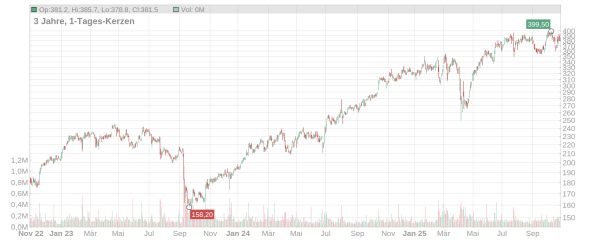 Der Kurs der MTU-Aktie tendiert seit Sommer unterm Strich eher seitwärts und notiert aktuell bei rund 382 Euro (Stand: 28. Oktober 2025, ca. 11 Uhr). Allerdings: Erst vor wenigen Wochen hat das Papier des Triebwerksherstellers mit fast 400 Euro ein weiteres Rekordhoch aufgestellt und seit Jahresbeginn steht ein Plus von knapp 19 Prozent auf der Kurstafel.