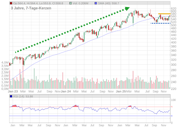 Nach dem Erreichen des Höchststandes, sehen wir eine Konsolidierungsphase innerhalb eines starken Aufwärtstrends. Von der Unterstützung (blau gestrichelte Linie) knapp unter 520 Euro versuchen die Bullen jetzt die 40-Wochenlinie zurückzuerobern. Ein Ausbruch über die orange Widerstandslinie bei rund 575 Euro wäre das nächste positive Signal. Nach dem Allzeithoch ist der Weg zu neuen Höchstständen frei. Ein Rutsch unter das September-Tief wäre hingegen ein Warnsignal und könnte eine größere Korrektur auslösen.