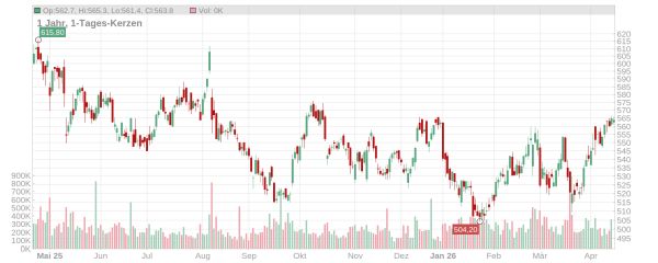 Der Kurs der Munich Re Aktie konnte in den letzten Handelswochen sehr gut performen und notiert aktuell – trotz der Schwächephase zu Jahresbeginn – leicht über dem Kurs von Anfang Januar bei 564 Euro (Stand: 20. April 2026, ca. 10 Uhr). Das Allzeithoch vom letzten Jahr (615 Euro im April 2025) ist allerdings weiterhin ein gutes Stück entfernt.