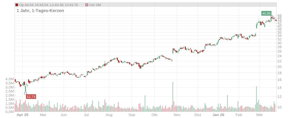 Der Kurs der Nordex Aktie hat zuletzt mit gut 46 Euro den höchsten Stand seit 2002 erreicht und notiert aktuell nur leicht darunter (Stand: 24. März 2026, ca. 10 Uhr). Seit Jahresbeginn steht ein Plus von etwa 50 Prozent auf der Kurstafel und auf Jahressicht sind es mehr als 180 Prozent.
