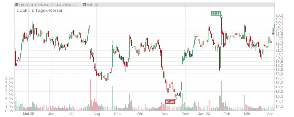 Der Kurs der Puma Aktie kletterte in den letzten Handelstagen recht deutlich und notiert aktuell bei knapp 25 Euro (Stand: 10. April 2026, ca. 11 Uhr). Nach dem schwachen Börsenjahr 2025 steht nun seit Jahresbeginn ein Plus von mehr als zehn Prozent auf der Kurstafel.