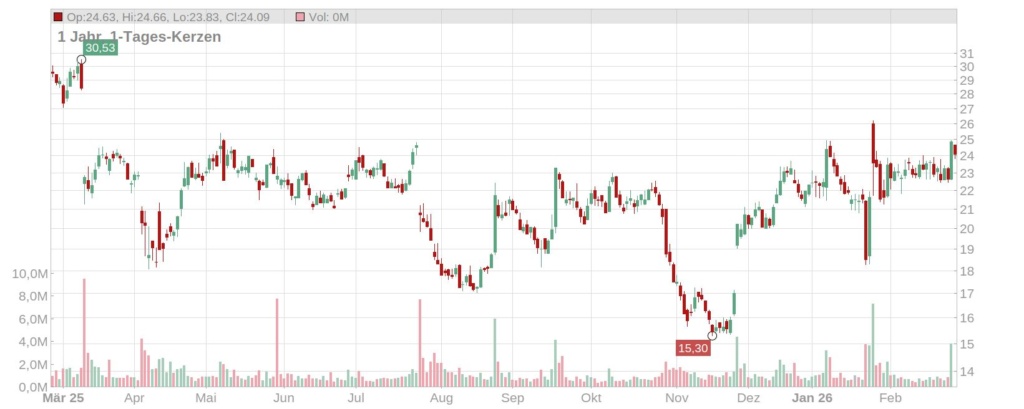 Der Kurs der Puma Aktie ist nach der Präsentation der Geschäftszahlen um einige Prozentpunkte gestiegen und notiert aktuell bei gut 24 Euro (Stand: 27. Februar 2026, ca. 10 Uhr). Seit Jahresbeginn steht nach dem sehr schwachen Börsenjahr 2025 ein leichtes Plus von etwa sieben Prozent auf der Kurstafel.
