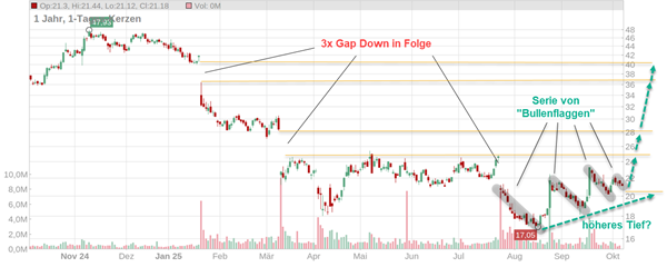 Auffällig sind drei Gap-downs in Folge, die jetzt Widerstandslinien auf dem Weg zurück nach oben darstellen. Positiv ist die Serie der darauffolgenden dreieinhalb Bullenflaggen-ähnlichen Formationen zu werten. Wünschenswert wäre jetzt noch eine Seitwärtsbewegung mit einem höheren Tief.