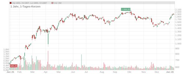 Im aktuellen Umfeld mit steigenden geopolitischen Risiken (unter anderem Venezuela, Iran, Grönland) ist für Rheinmetall auch der Sprung auf ein neues Rekordhoch denkbar. Das bisherige Allzeithoch wurde Anfang Oktober erreicht als der Kurs kurzzeitig über die Marke von 2.000 Euro kletterte. Für mittel- und langfristig orientierte Anleger sind die kurzfristigen Ausschläge allerdings weniger relevant.