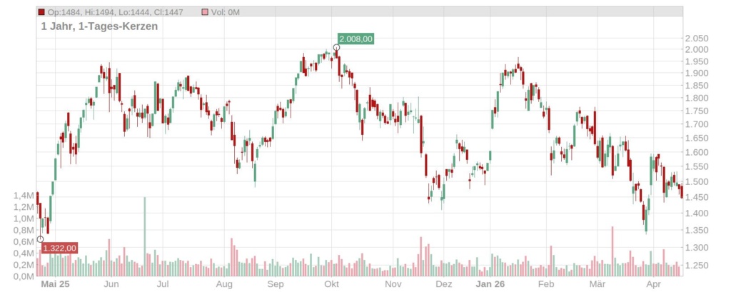 Trotz der strategisch vielversprechenden operativen Neuigkeiten zeigt sich die Rheinmetall Aktie am heutigen Dienstag eher verhalten. Laut tagesaktuellen Kursdaten notiert das Papier (ISIN: DE0007030009) am frühen Nachmittag bei rund 1.450 Euro und verzeichnet damit moderate Verluste im Vergleich zum Vortag.