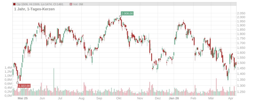 Am heutigen Dienstag zeigt sich die Rheinmetall Aktie in einem ruhigeren Marktumfeld leicht schwächer. Am frühen Dienstagnachmittag notierte das Papier auf Tradegate bei rund 1.485 Euro und gab damit moderat nach. Aktuell ist hier für Anleger noch weiter Geduld gefragt – vielleicht bis zu den kommenden Quartalszahlen.