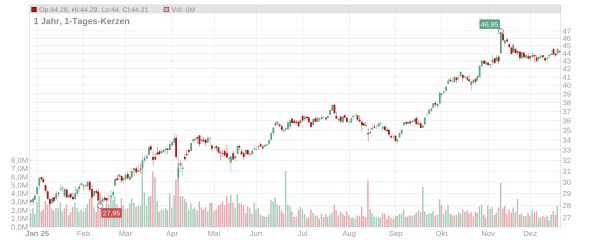 Der Kurs der RWE-Aktie notiert aktuell bei rund 44 Euro und damit nur knapp unter dem Mehrjahreshoch von etwa 47 Euro aus Mitte November (Stand: 22. Dezember 2025, ca. 12 Uhr). Seit Jahresbeginn steht ein sattes Plus von mehr als 50 Prozent auf der Kurstafel.