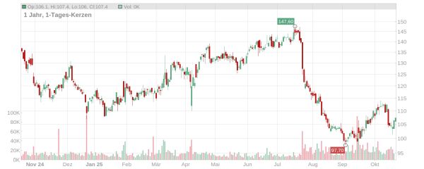 Der Kurs der Atoss-Aktie konnte sich seit dem Tiefpunkt im September (bei etwa 100 Euro) wieder etwas fangen und notiert aktuell bei 107 Euro (Stand: 21. Oktober 2025, ca. 13 Uhr). Allerdings hatte das Papier seit dem Einbruch Ende Juli zwischenzeitlich mehr als 30 Prozent verloren. Vorausgegangen war ein neues Allzeithoch des Software-Konzerns.