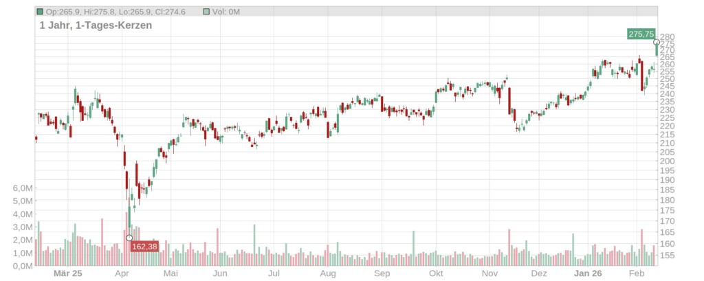 Der Kurs der Siemens Aktie ist nach der Präsentation der Quartalszahlen deutlich um etwa sieben Prozent gestiegen und notiert aktuell mit rund 274 Euro so hoch wie nie zuvor (Stand: 12. Februar 2026, ca. 12 Uhr). Im Börsenjahr 2026 hat das DAX-Papier bereits mehrere Allzeithochs aufgestellt, heute kletterte das Papier erstmals über 270 Euro.