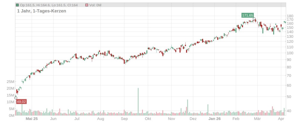 Diese operative und strategische Stärke spiegelt sich eindrucksvoll in der Kursentwicklung wider. Die Siemens Energy Aktie reitet an der Börse derzeit auf einer beispiellosen Erfolgswelle. Erst am gestrigen Handelstag katapultierten makroökonomische Entlastungen – darunter vor allem geopolitische Entspannungssignale und eine Waffenruhe im Nahen Osten – sowie der makellose fundamentale Newsflow den Kurs massiv nach oben. Die Aktie schloss den Xetra-Handel gestern mit einem fulminanten Kurssprung von annähernd 12 Prozent bei 165,38 Euro ab.