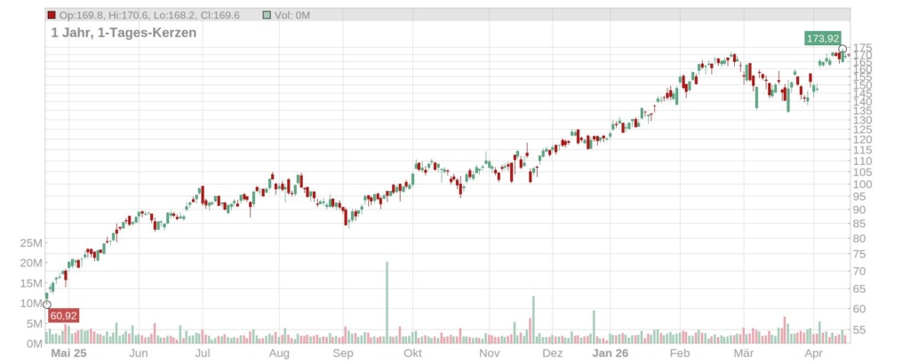 Der konsequente Vollzug des Rückkaufprogramms trifft auf ein überaus positives Marktumfeld für den Münchener Konzern. Am frühen Dienstagnachmittag notierte die Siemens Energy Aktie bei rund 169 Euro. Damit bewegt sich das Papier nur moderat unter seinem erst vor wenigen Tagen (am 17. April 2026) markierten Allzeithoch von 173,92 Euro. Nach einer rasanten Kursrallye seit Jahresbeginn – angetrieben durch eine Verdreifachung des Nettogewinns im ersten Quartal sowie einen historischen Auftragsbestand von rund 146 Milliarden Euro – legt die Aktie aktuell eine gesunde Konsolidierungsphase ein.