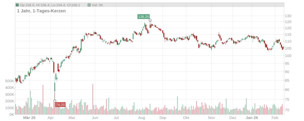 Der Kurs der Talanx Aktie ist nach der Präsentation der vorläufigen Geschäftszahlen für 2025 um einige Prozentpunkte gesunken und notiert aktuell bei gut 106 Euro (Stand: 13. Februar 2026, ca. 10 Uhr). Damit steht seit Jahresbeginn ein Minus von etwa sieben Prozent auf der Kurstafel – die Rekordkurse aus dem letzten Sommer von teils mehr als 120 Euro sind ein gutes Stück entfernt.