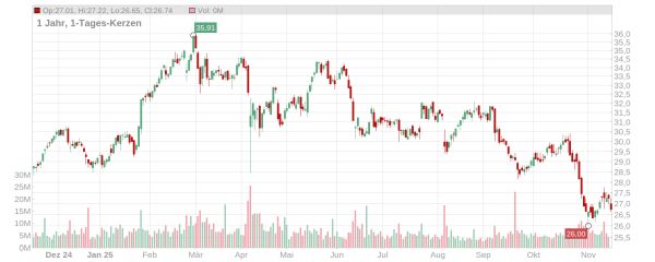 Der Kurs der Deutsche Telekom-Aktie ist in den vergangenen vier Wochen um gut zehn Prozent gesunken und notiert aktuell bei knapp 27 Euro (Stand: 18. November 2025, ca. 11 Uhr). Auch nach den insgesamt sehr ordentlichen Quartalszahlen hat das Papier nicht gut performt und seit Jahresbeginn steht ein leichtes Minus auf der Kurstafel.