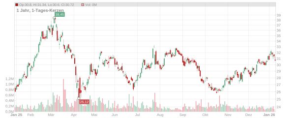 In der letzten Handelswoche haben einige Analysten ihre Kursziele bestätigt oder angepasst. Während beispielsweise JPMorgan (30 Euro) und Bernstein Research (36 Euro) ihre Ziele bestätigten, blickt Goldman Sachs etwas optimistischer (von 30,90 auf 31,80 Euro angehoben) sowie die Deutsche Bank etwas pessimistischer (von 35 auf 32 Euro gesenkt) auf das Papier.