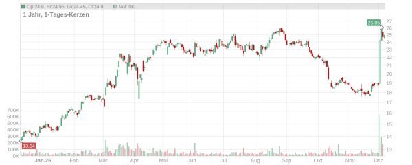 Der Kurs der Wacker Neuson-Aktie ist in den letzten Handelstagen regelrecht explodiert und notiert derzeit mit knapp 25 Euro gut 30 Prozent höher als noch vor drei Tagen (Stand: 05. Dezember 2025, ca. 11 Uhr). Damit hat das Papier die Kursverluste der letzten Wochen und Monate – Ende August notierte die Wacker Neuson-Aktie bereits auf diesem Niveau – mit einem Schlag wieder aufgefangen.