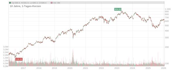 Die morgigen Jahresergebnisse sind für die weitere Richtung der LVMH Aktie entscheidend. Der aktuelle Kurs von 588,70 Euro preist bereits viele Risiken ein, was das Abwärtspotenzial bei moderat enttäuschenden Zahlen begrenzen könnte.