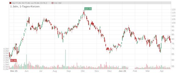 Die Hensoldt Aktie kommt nicht mehr vom Fleck und notiert bei rund 76 Euro (Stand: 23. April 2026, ca. 11 Uhr). Damit steht seit Anfang Januar eine Nullrunde auf der Kurstafel. Nach der starken Rally im Vorjahr steht das Papier nun unter Druck, die hohen Erwartungen zu erfüllen. Findet die Rüstungsaktie nun bald zurück zu alter Stärke? In den kommenden Wochen stehen entscheidende Termine an.