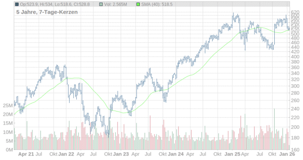 Nach einer ausgedehnten Konsolidierung im vergangenen Jahr hatte sich der Aktienkurs zuletzt seinem Allzeithoch bei 616 Dollar genähert. Nach der Zahlenvorlage fiel die Notierung zunächst wieder zurück, konnte sich aber knapp über der bei 516 Dollar verlaufenden 200-Tage-Linie stabilisieren.